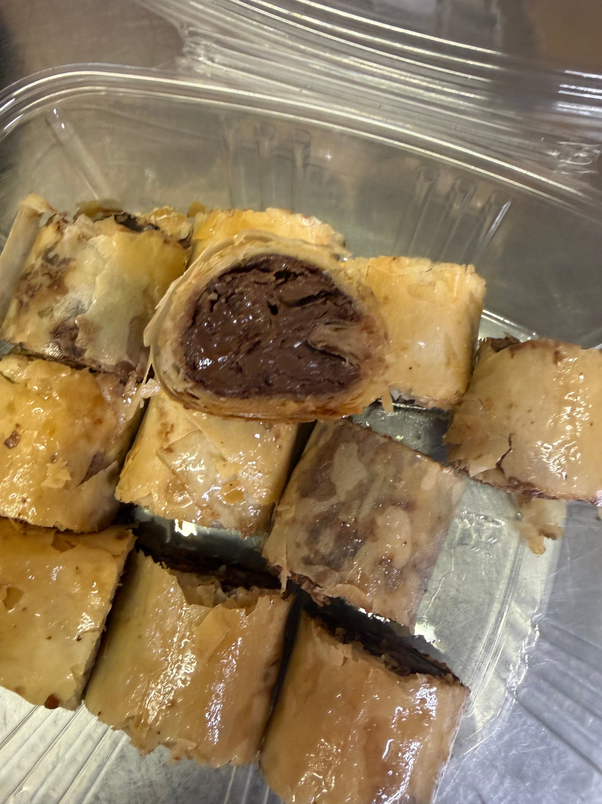 Generous amount of Nutella rolled in our fillo dough, baked and slightly brushed with our homemade syrup.