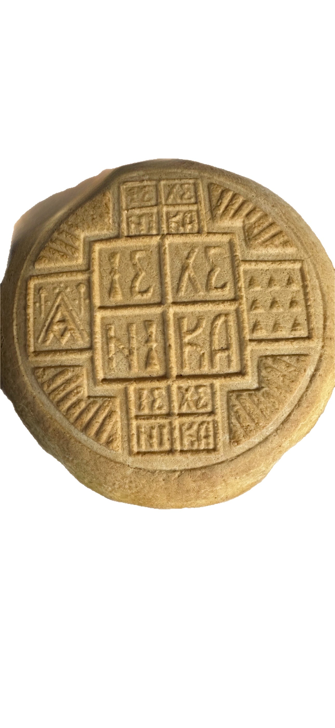 Prosphora bread is specially baked for the purpose of communion, and it is called "Prosphora" (meaning "that which is offered" in Greek.) Prosphora is made from only four ingredients, wheat flour (white), yeast, salt, and water. Donated to the church by members as the priest prepares it for the holy communion. Price set slightly above cost for labor and ingredients to help our church community. Each bread weighs a pound and a half before baking
